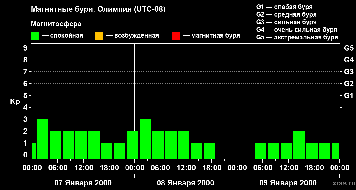 Изменения геомагнитного индекса Kp с 7 по 9 января 2000 года для средних широт