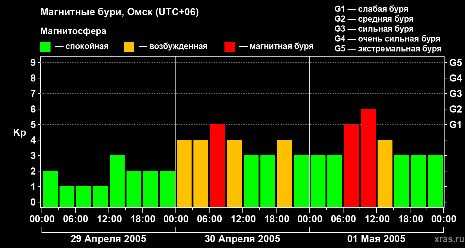 Изменения геомагнитного индекса Kp с 29 апреля по 1 мая 2005 года для средних широт