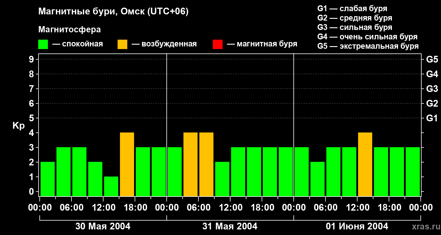 Изменения геомагнитного индекса Kp с 30 мая по 1 июня 2004 года для средних широт