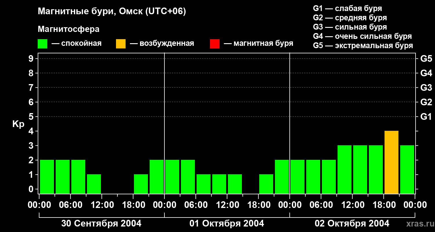 Изменения геомагнитного индекса Kp с 30 сентября по 2 октября 2004 года для средних широт