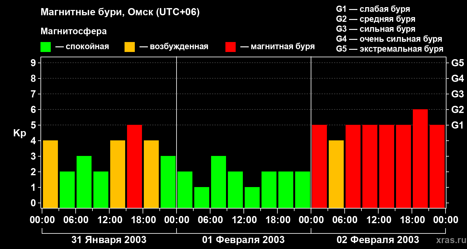 Изменения геомагнитного индекса Kp с 31 января по 2 февраля 2003 года для средних широт