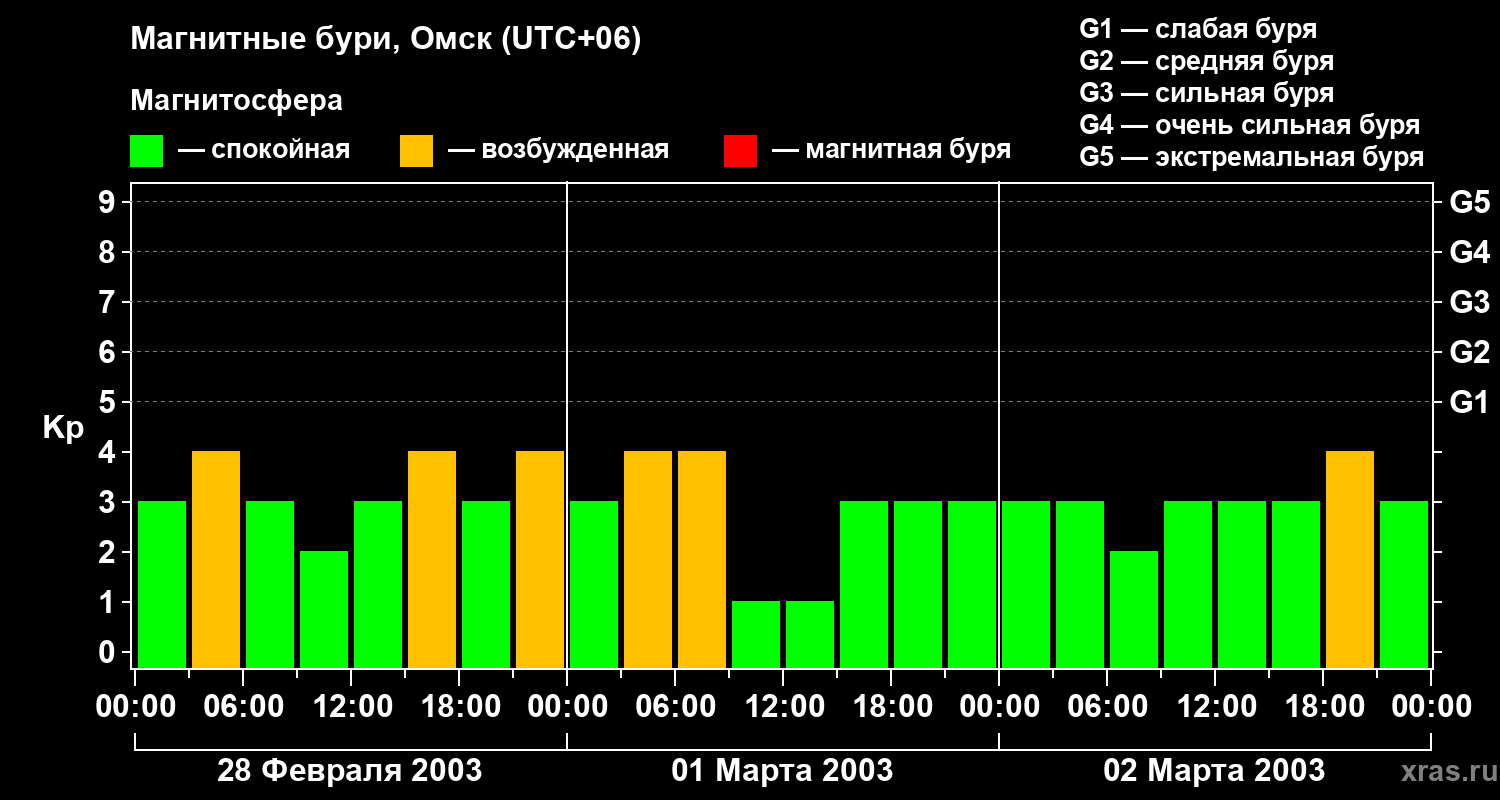 Изменения геомагнитного индекса Kp с 28 февраля по 2 марта 2003 года для средних широт