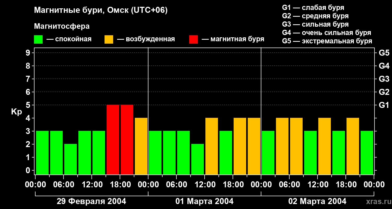 Изменения геомагнитного индекса Kp с 29 февраля по 2 марта 2004 года для средних широт