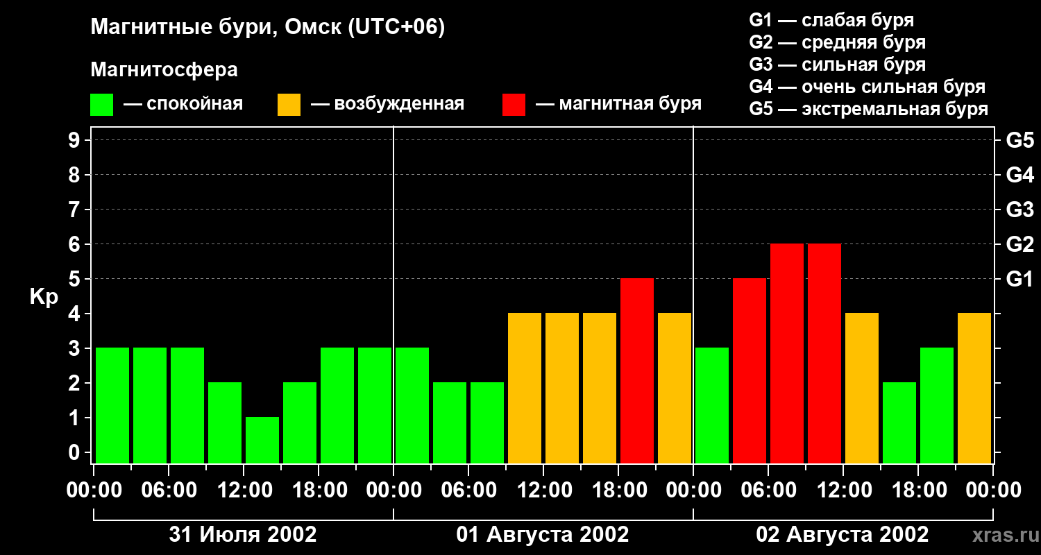 Изменения геомагнитного индекса Kp с 31 июля по 2 августа 2002 года для средних широт