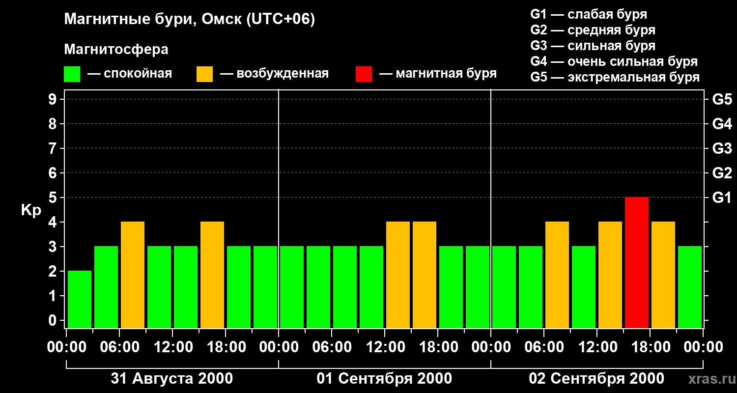 Изменения геомагнитного индекса Kp с 31 августа по 2 сентября 2000 года для средних широт