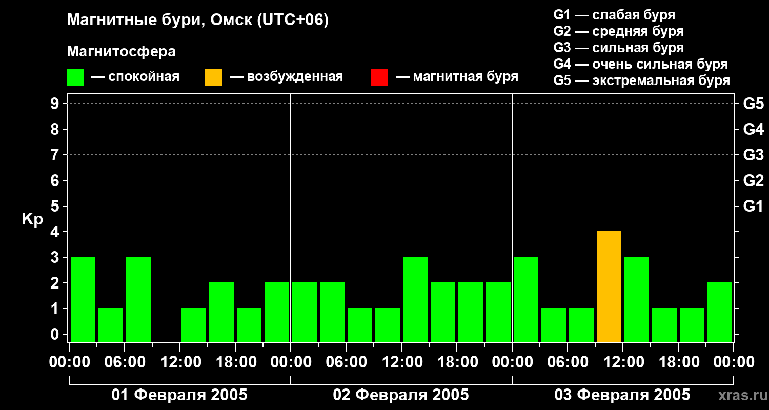 Изменения геомагнитного индекса Kp с 1 по 3 февраля 2005 года для средних широт