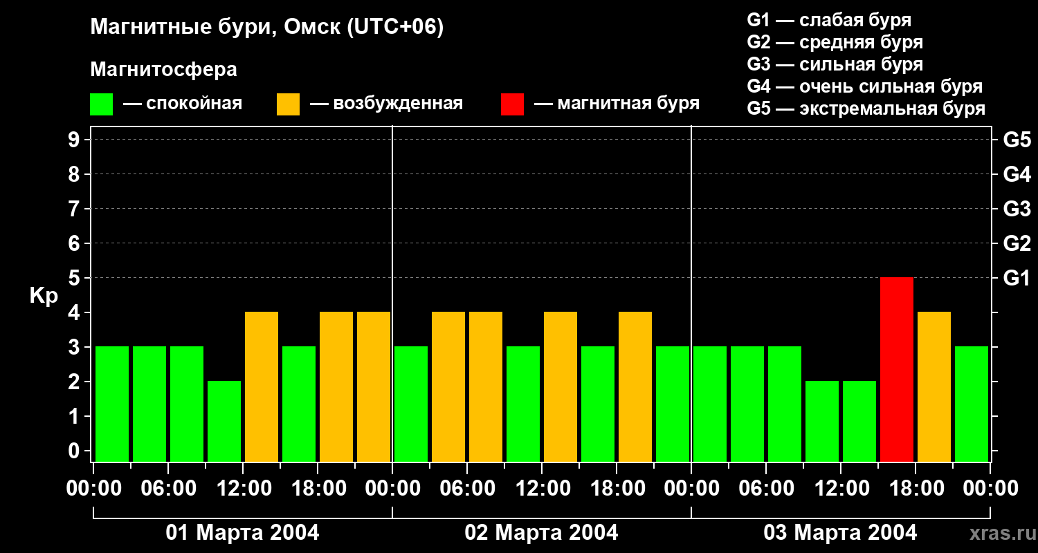 Изменения геомагнитного индекса Kp с 1 по 3 марта 2004 года для средних широт