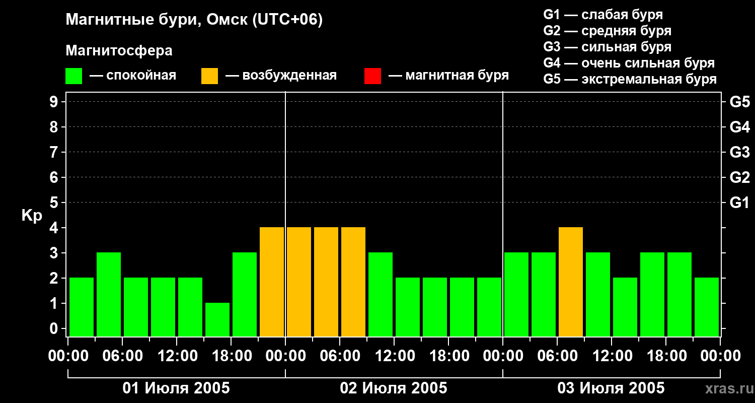Изменения геомагнитного индекса Kp с 1 по 3 июля 2005 года для средних широт