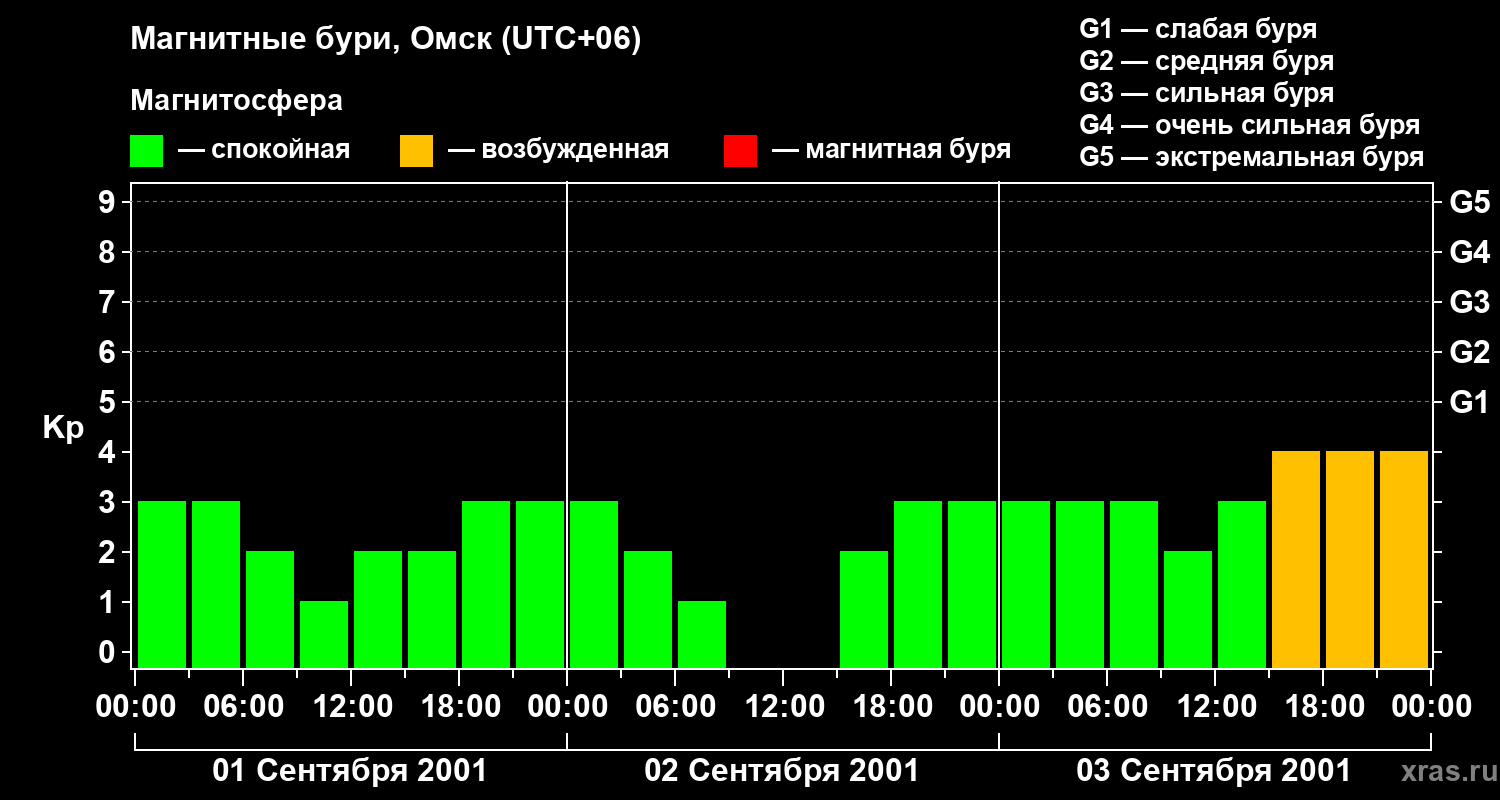 Изменения геомагнитного индекса Kp с 1 по 3 сентября 2001 года для средних широт