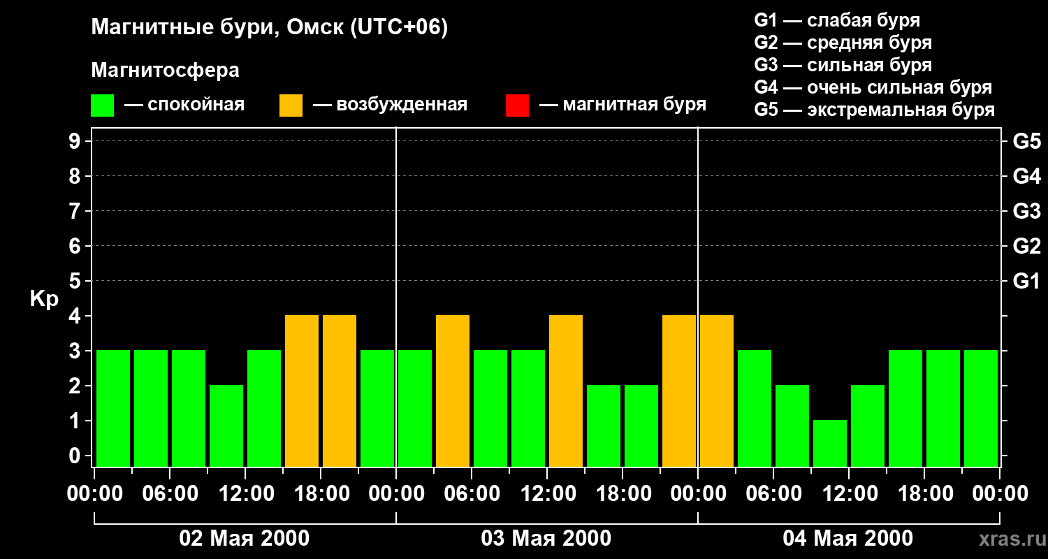 Изменения геомагнитного индекса Kp с 2 по 4 мая 2000 года для средних широт