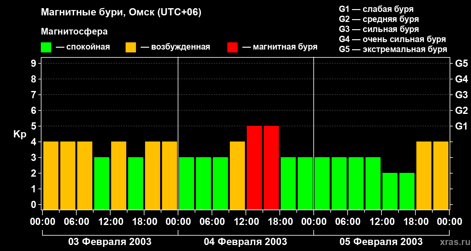 Изменения геомагнитного индекса Kp с 3 по 5 февраля 2003 года для средних широт