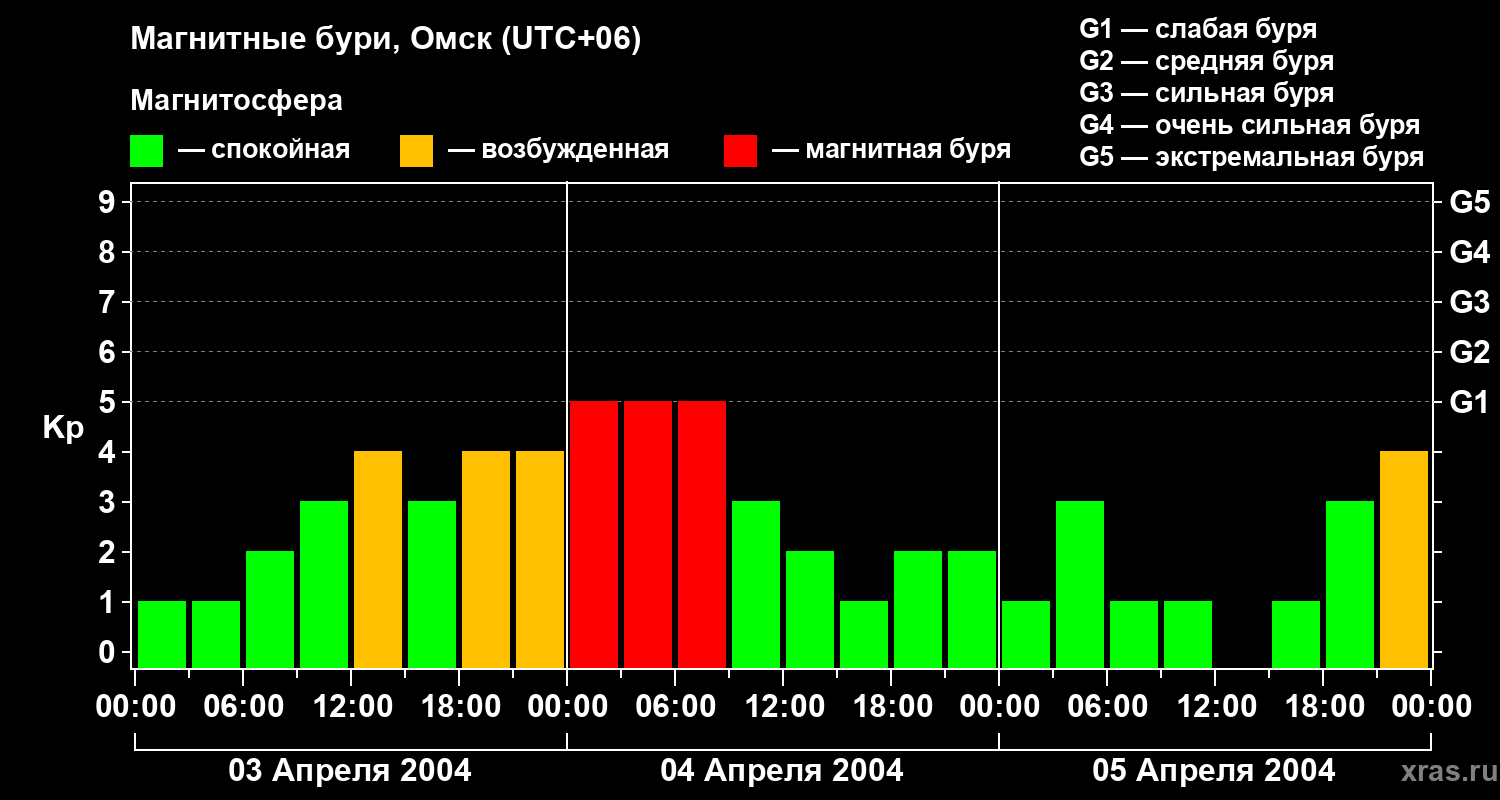 Изменения геомагнитного индекса Kp с 3 по 5 апреля 2004 года для средних широт