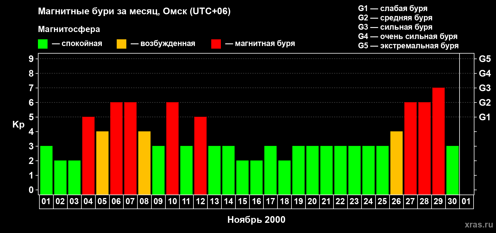 Изменения максимального суточного геомагнитного индекса Kp в ноябре 2000 года для средних широт