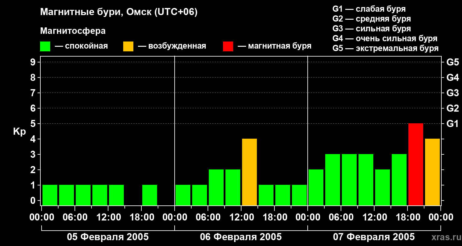 Изменения геомагнитного индекса Kp с 5 по 7 февраля 2005 года для средних широт