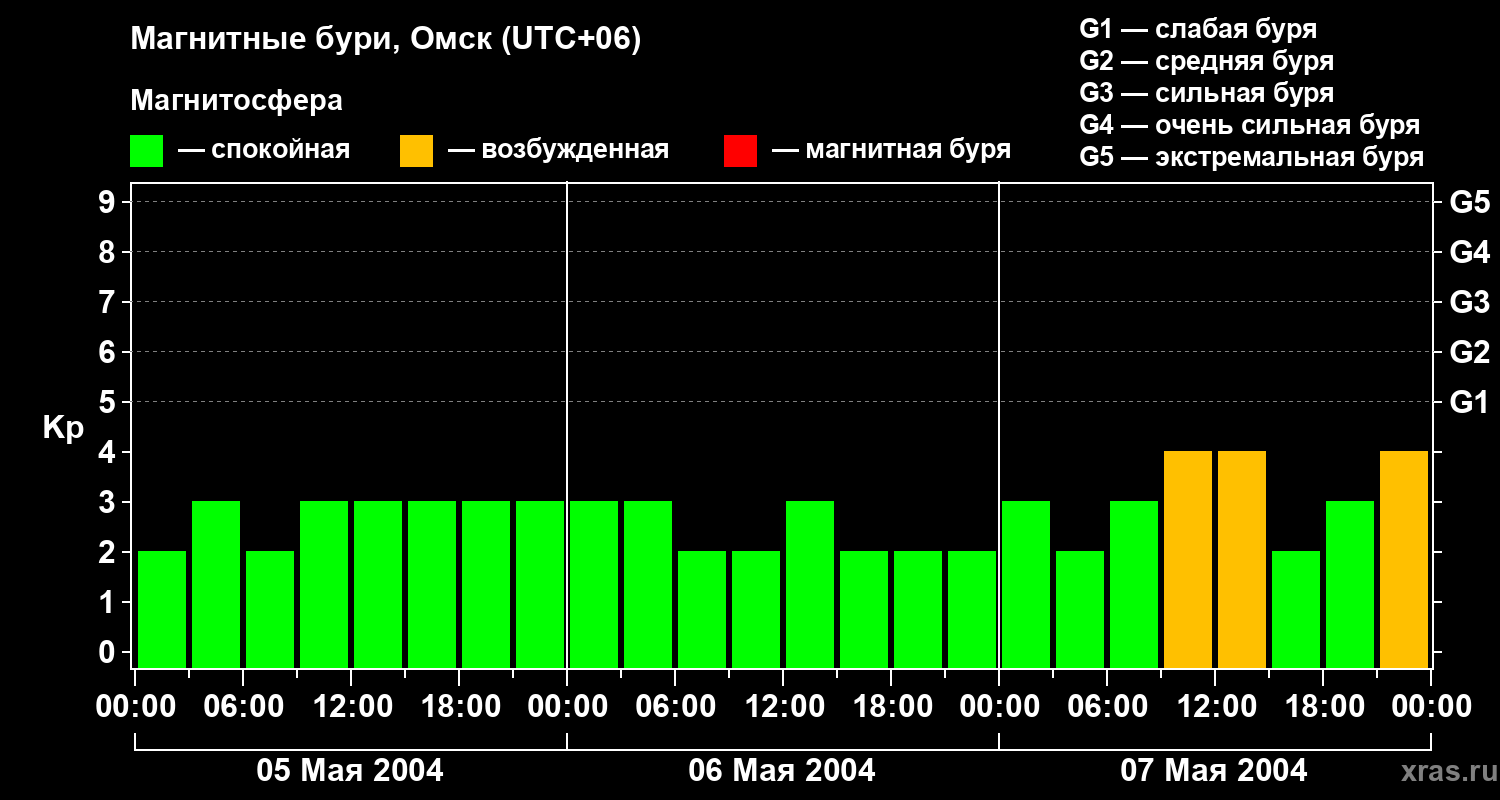 Изменения геомагнитного индекса Kp с 5 по 7 мая 2004 года для средних широт