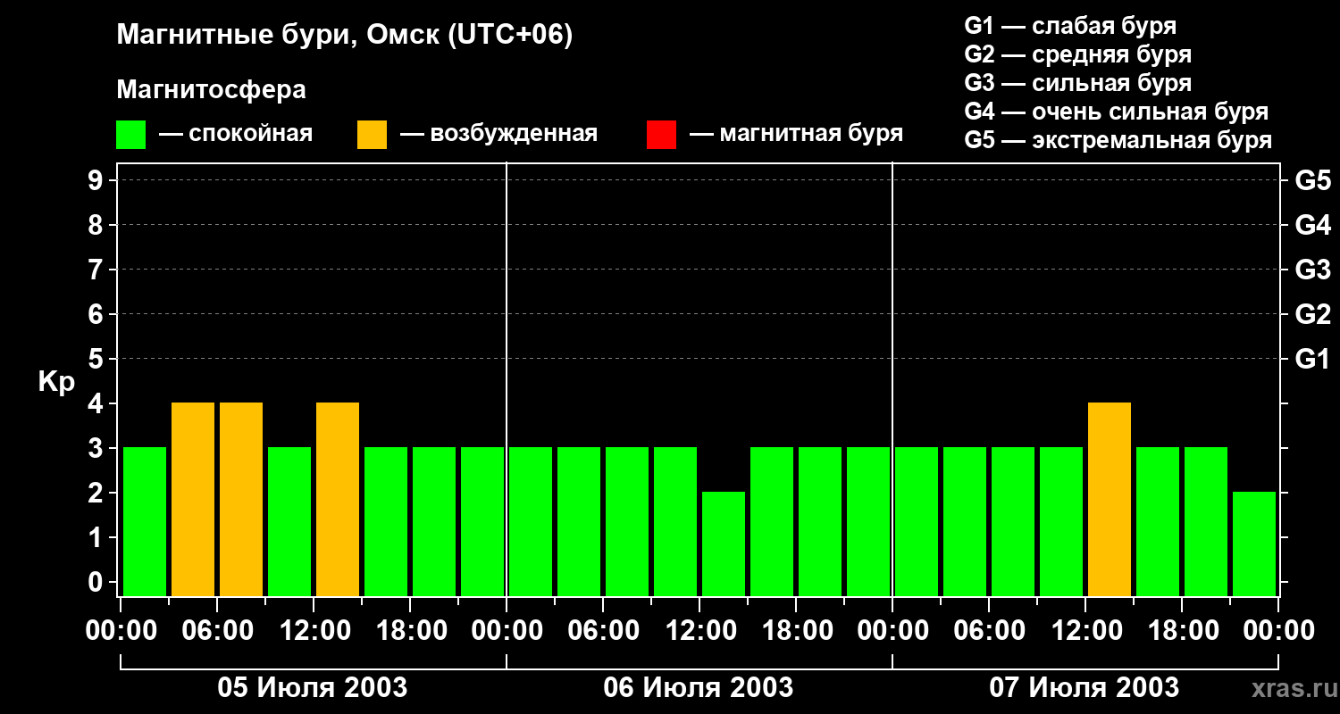 Изменения геомагнитного индекса Kp с 5 по 7 июля 2003 года для средних широт