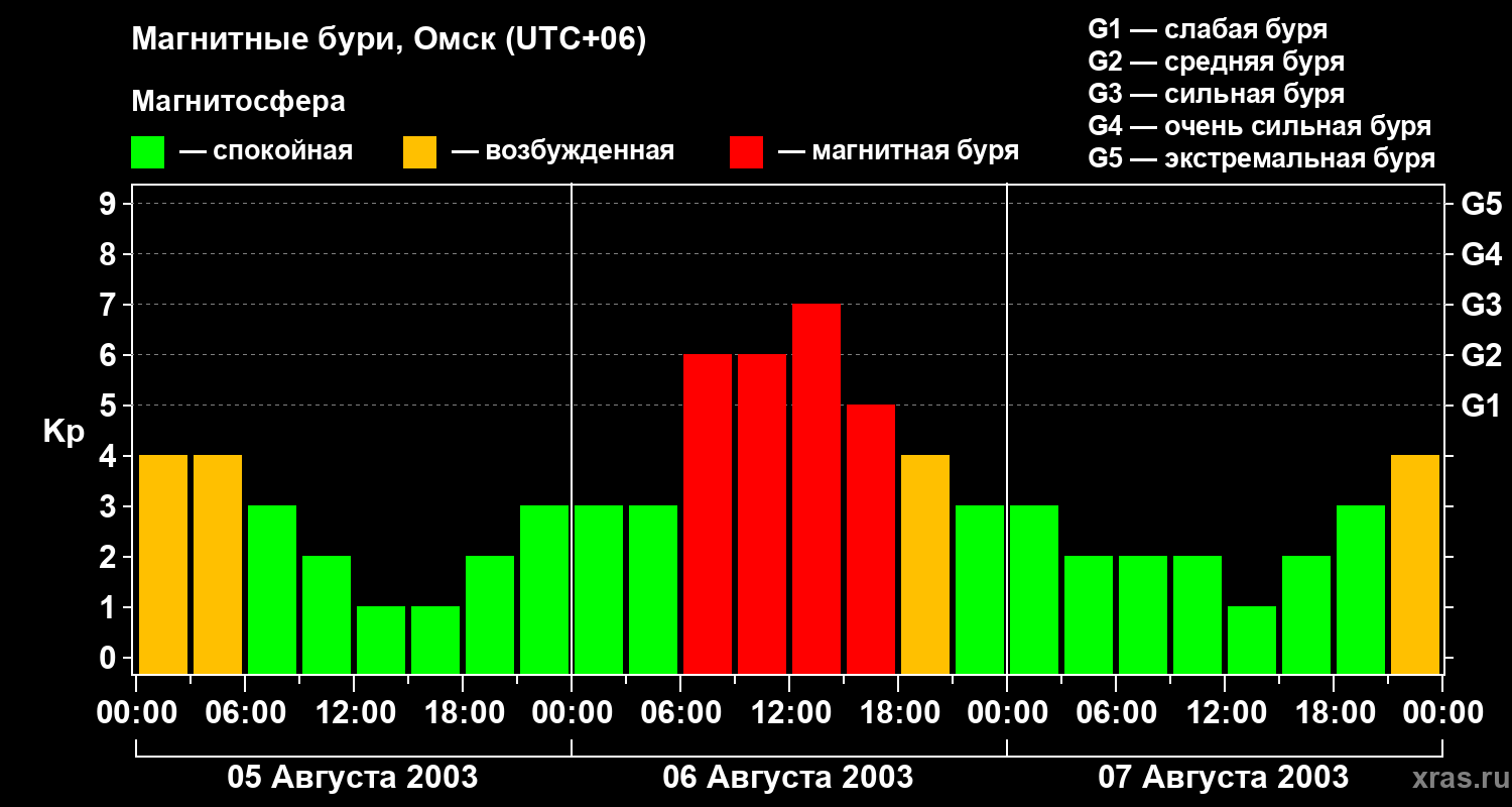 Изменения геомагнитного индекса Kp с 5 по 7 августа 2003 года для средних широт