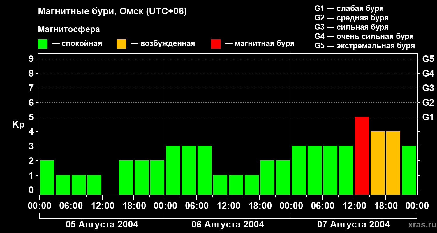 Изменения геомагнитного индекса Kp с 5 по 7 августа 2004 года для средних широт