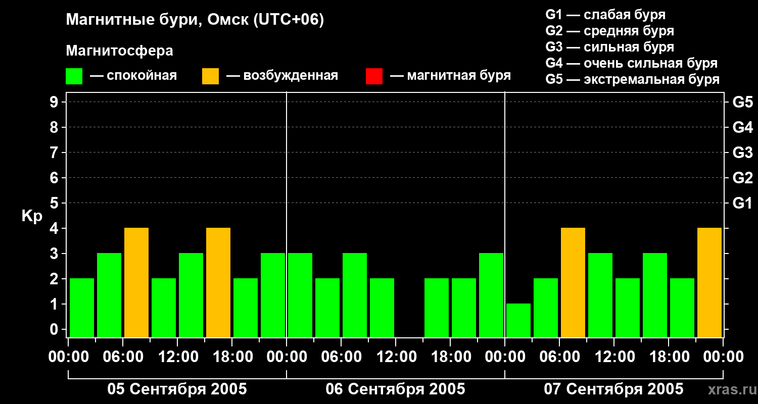 Изменения геомагнитного индекса Kp с 5 по 7 сентября 2005 года для средних широт