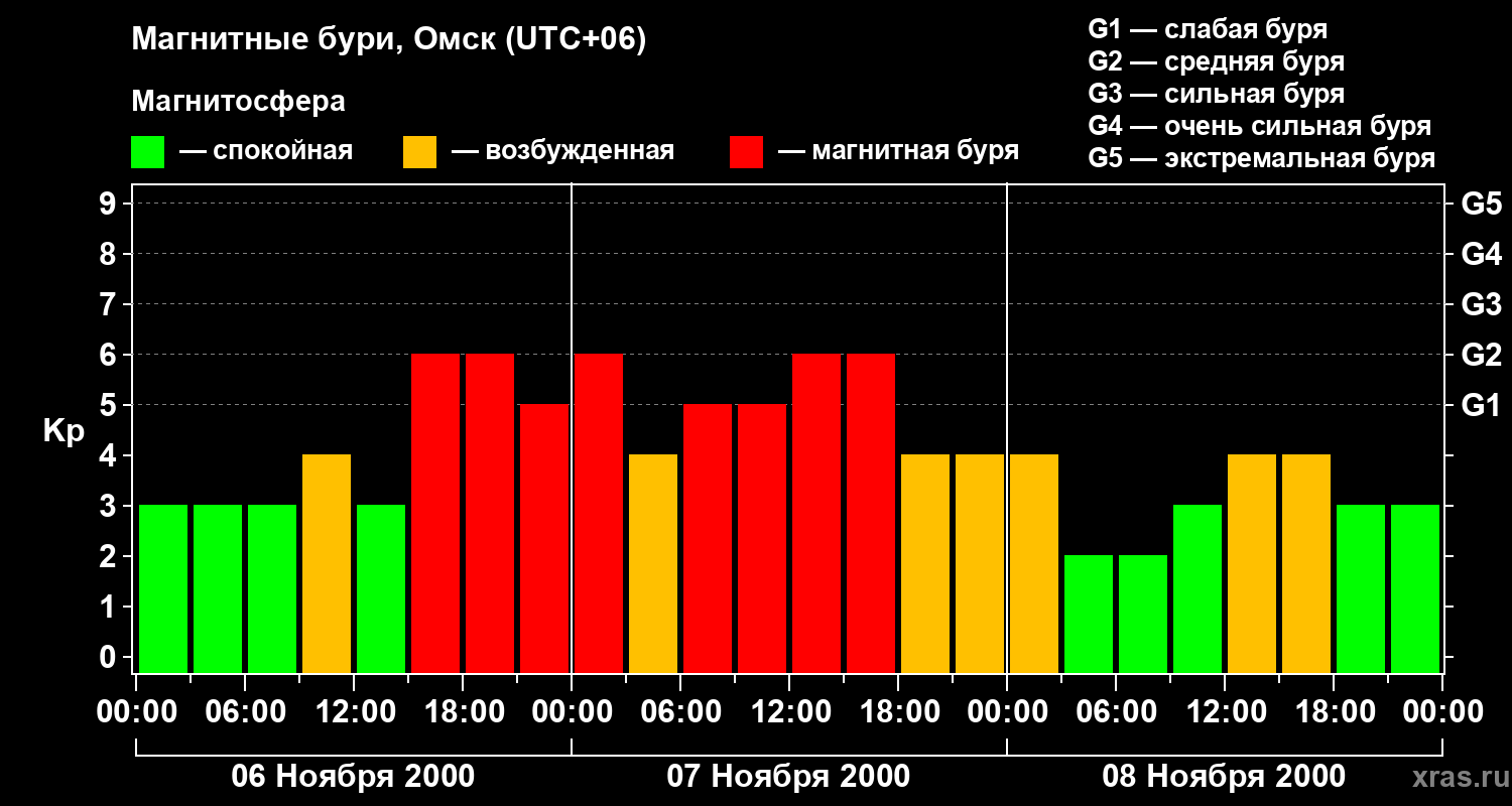 Изменения геомагнитного индекса Kp с 6 по 8 ноября 2000 года для средних широт