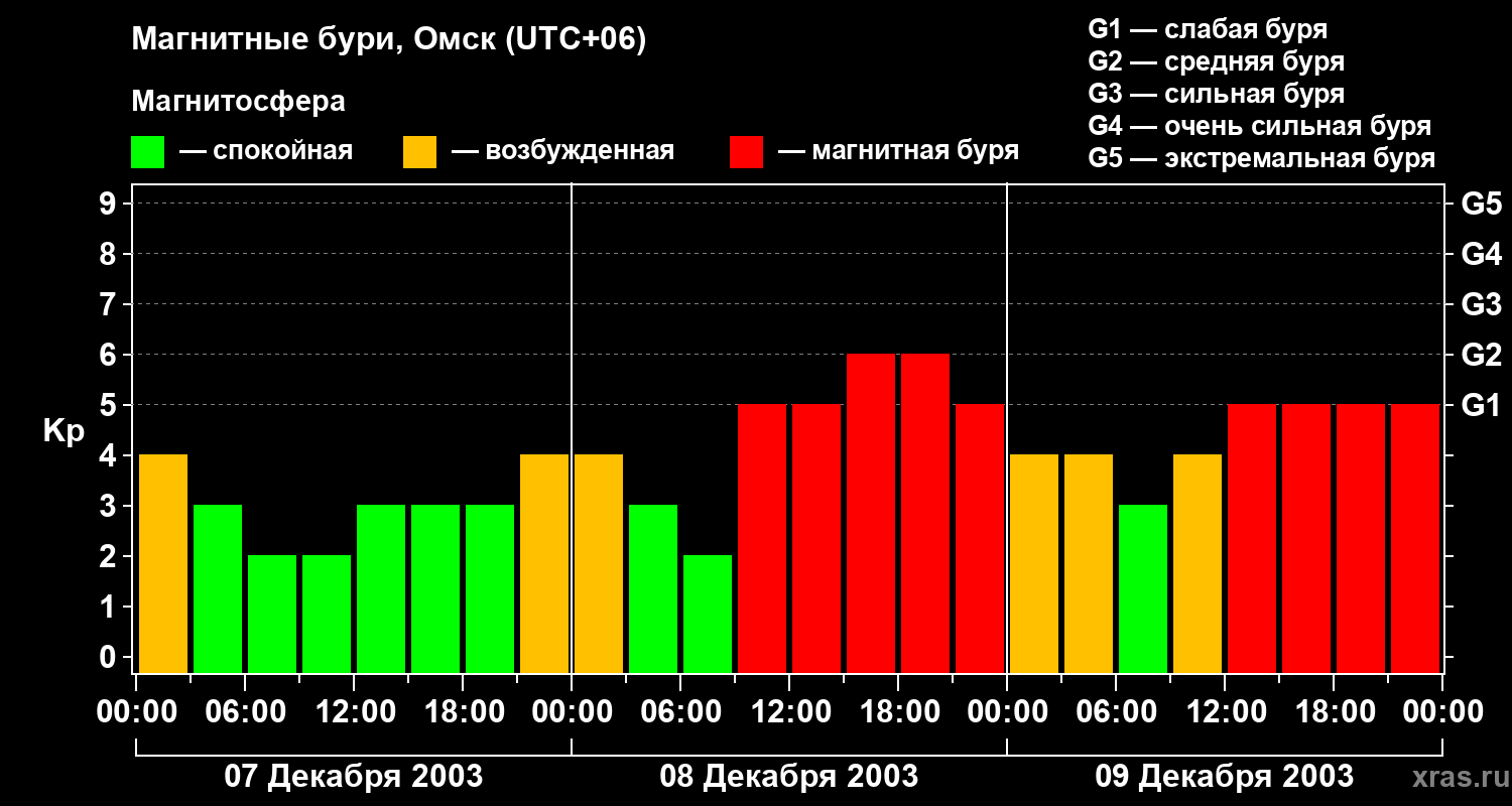 Изменения геомагнитного индекса Kp с 7 по 9 декабря 2003 года для средних широт
