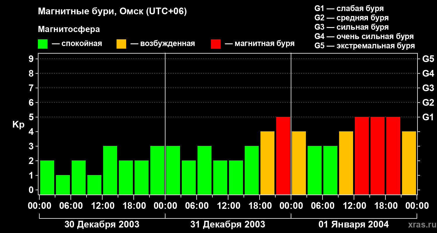 Изменения геомагнитного индекса Kp с 30 декабря 2003 года по 1 января 2004 года для средних широт