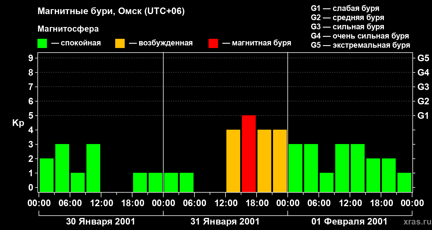 Изменения геомагнитного индекса Kp с 30 января по 1 февраля 2001 года для средних широт