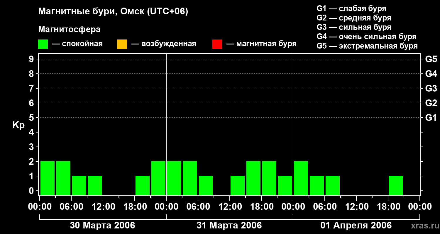 Изменения геомагнитного индекса Kp с 30 марта по 1 апреля 2006 года для средних широт