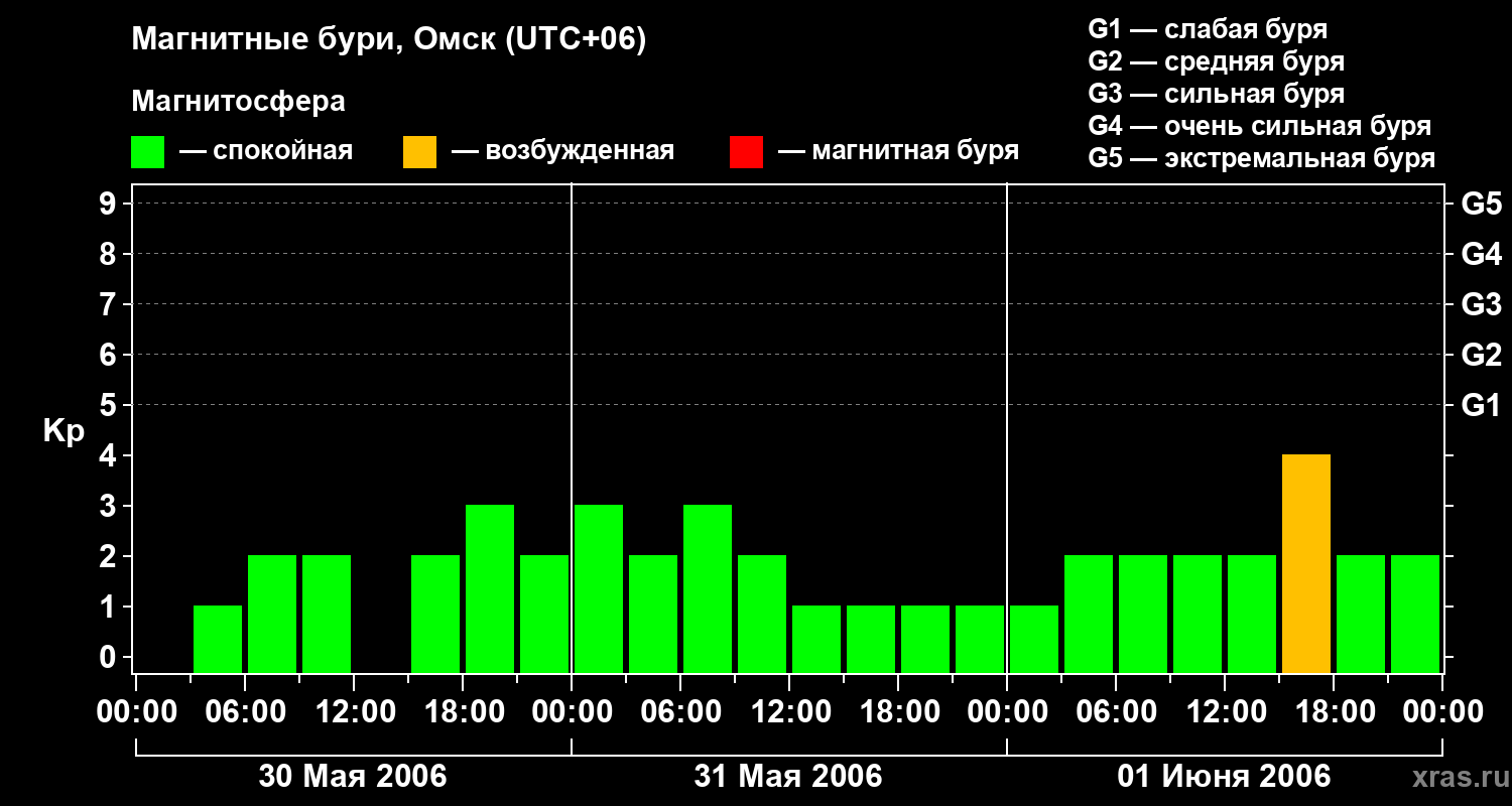Изменения геомагнитного индекса Kp с 30 мая по 1 июня 2006 года для средних широт