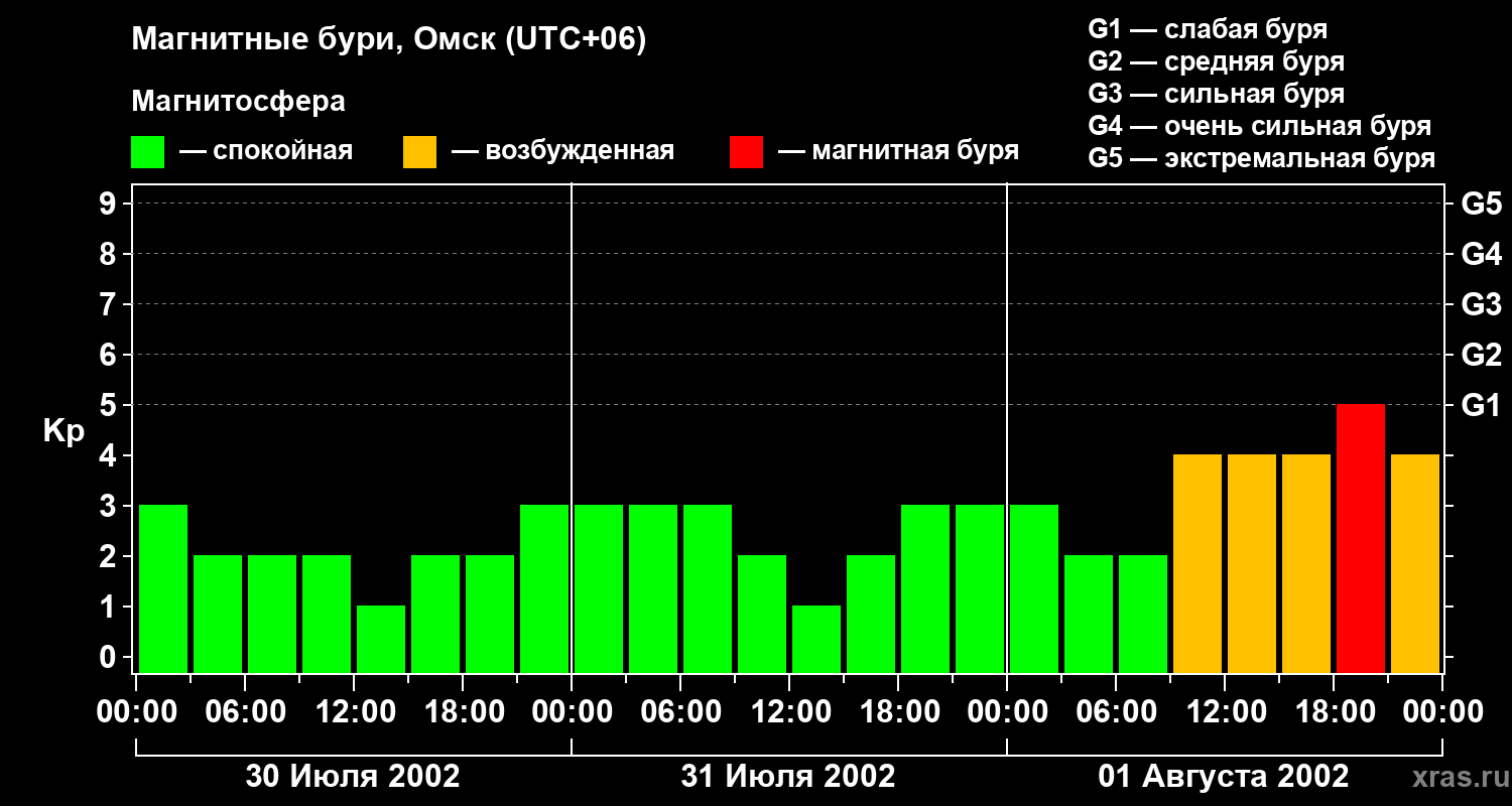 Изменения геомагнитного индекса Kp с 30 июля по 1 августа 2002 года для средних широт
