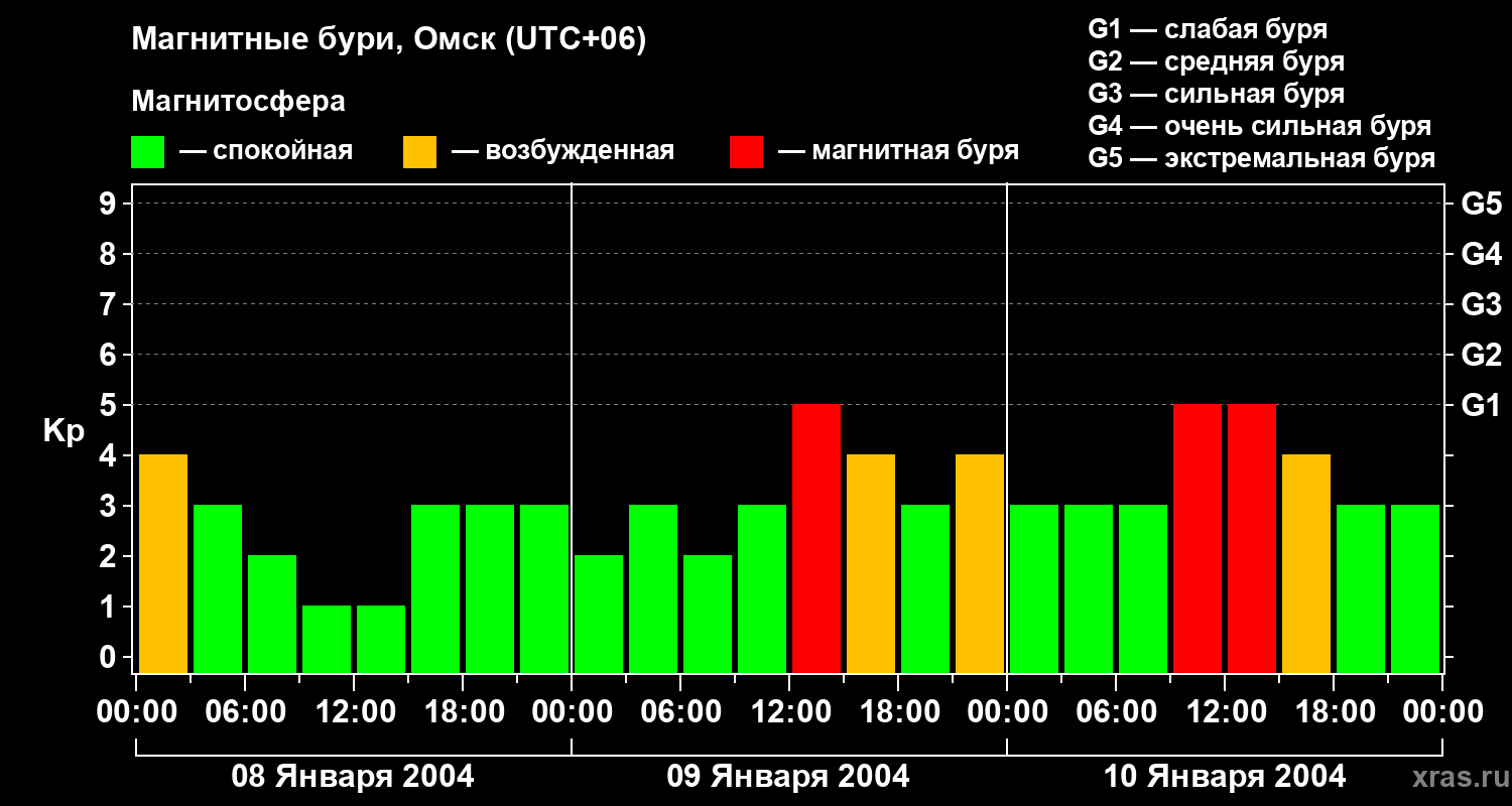 Изменения геомагнитного индекса Kp с 8 по 10 января 2004 года для средних широт