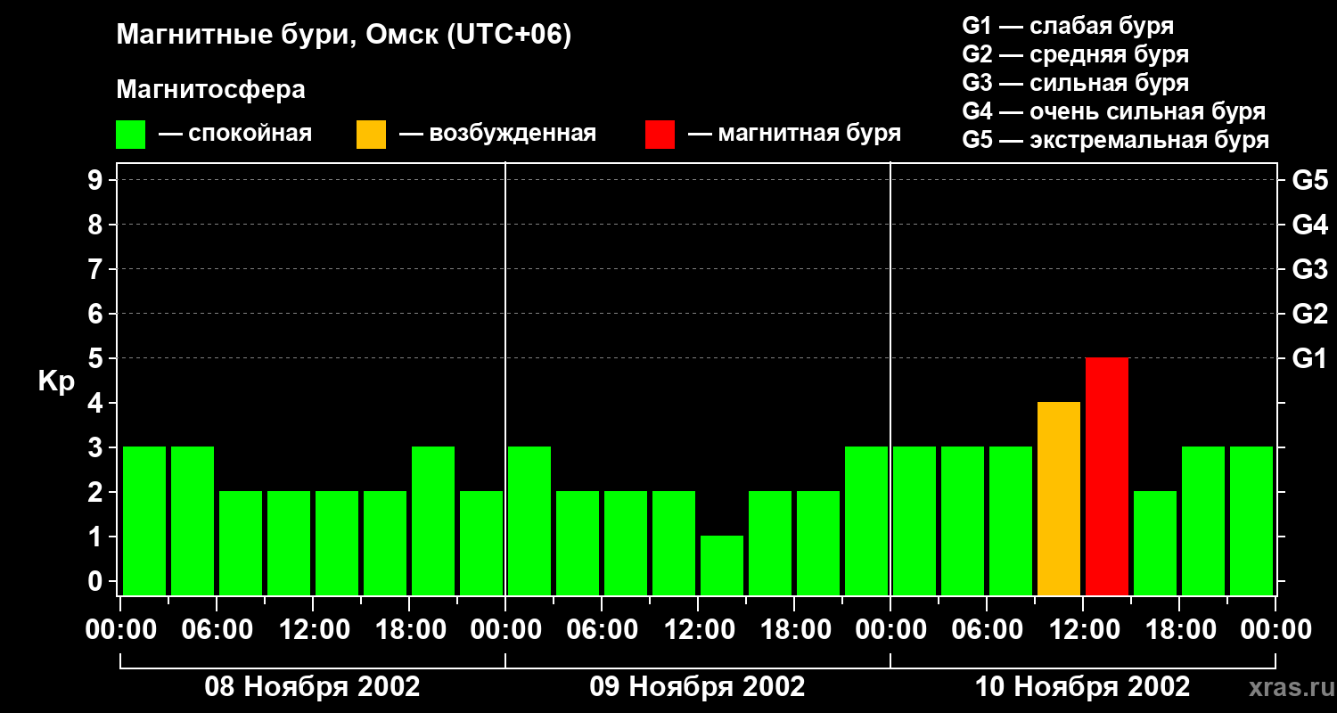 Изменения геомагнитного индекса Kp с 8 по 10 ноября 2002 года для средних широт