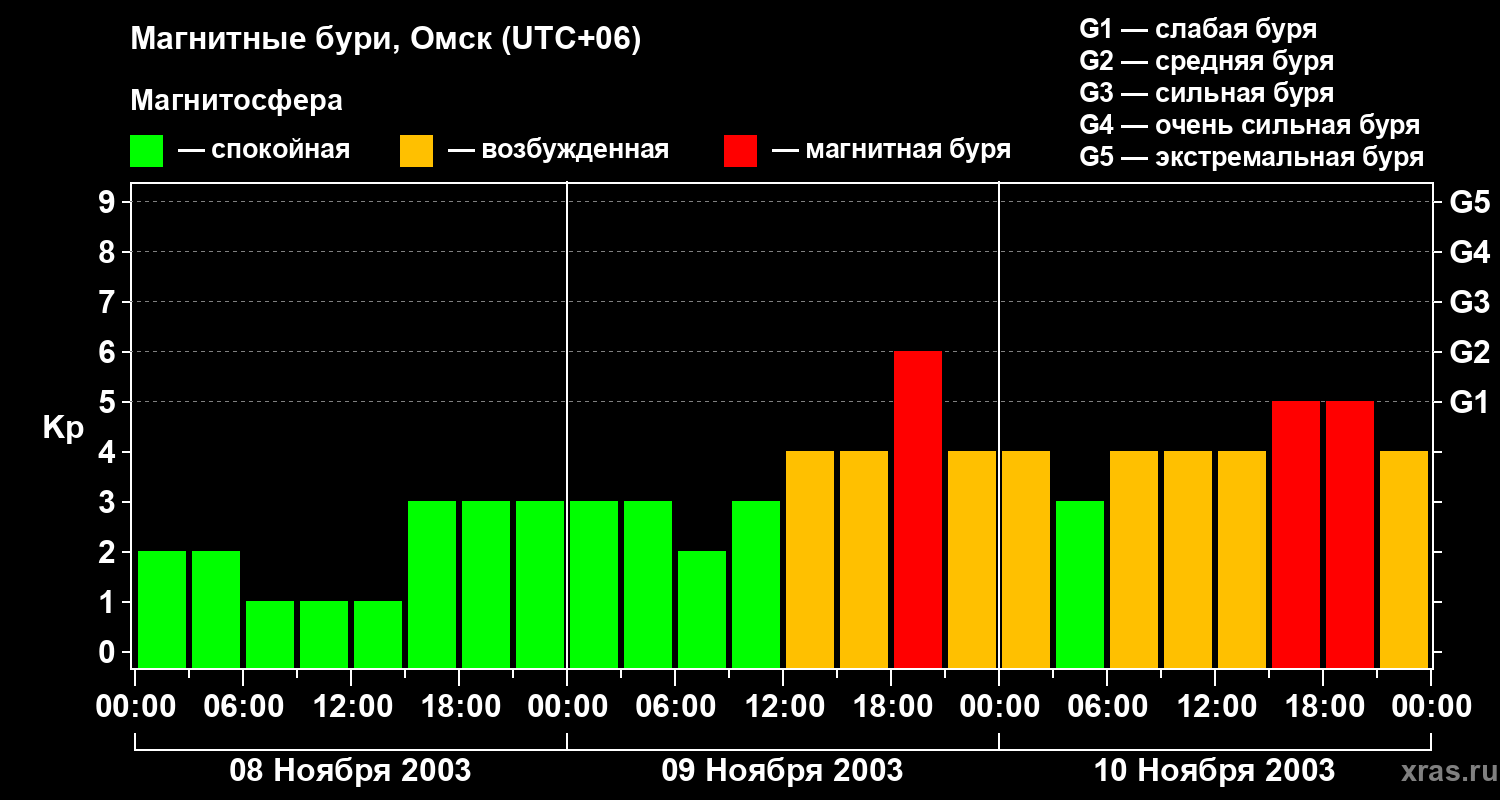 Изменения геомагнитного индекса Kp с 8 по 10 ноября 2003 года для средних широт