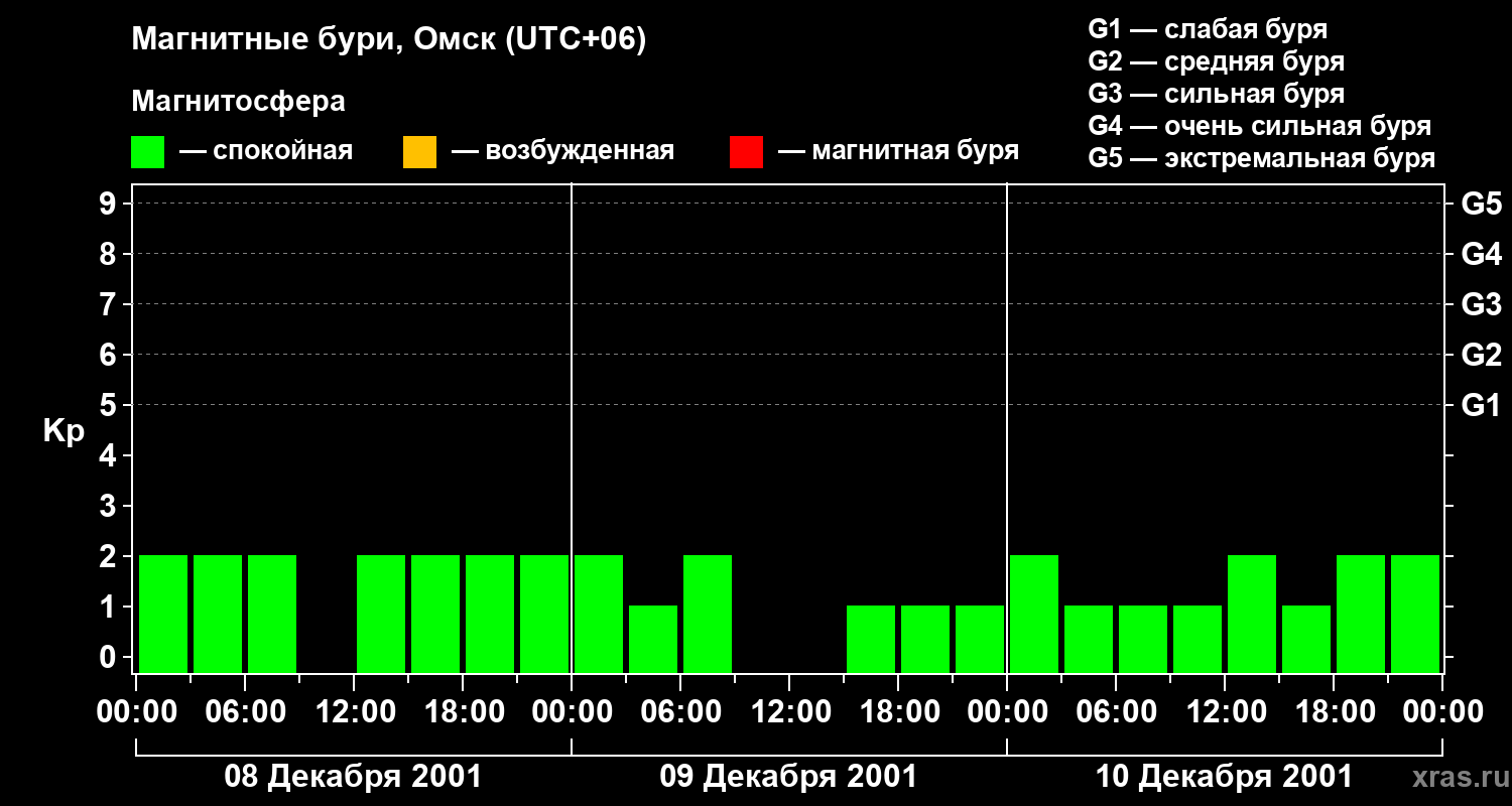 Изменения геомагнитного индекса Kp с 8 по 10 декабря 2001 года для средних широт