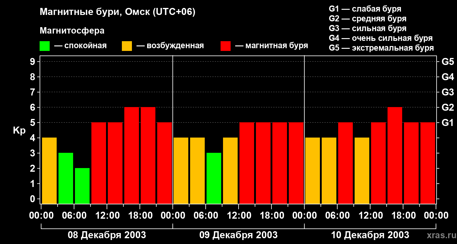 Изменения геомагнитного индекса Kp с 8 по 10 декабря 2003 года для средних широт
