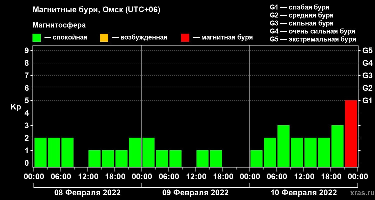 Изменения геомагнитного индекса Kp с 8 по 10 февраля 2022 года для средних широт