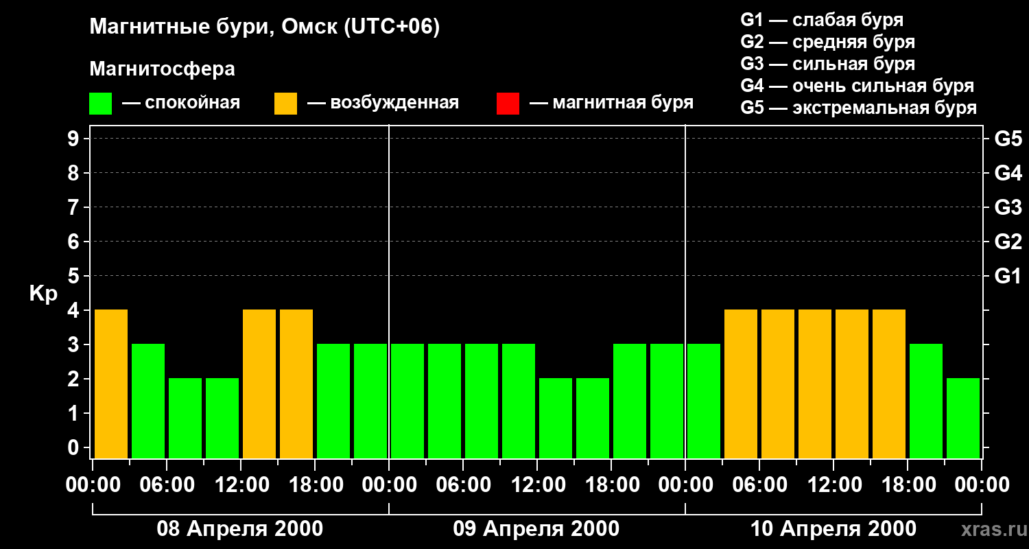 Изменения геомагнитного индекса Kp с 8 по 10 апреля 2000 года для средних широт