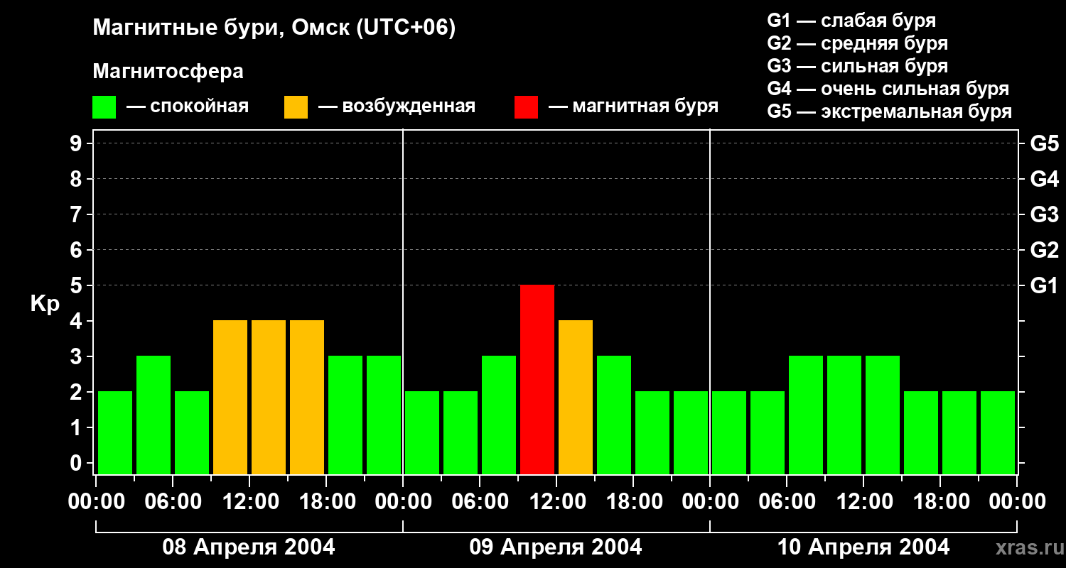 Изменения геомагнитного индекса Kp с 8 по 10 апреля 2004 года для средних широт