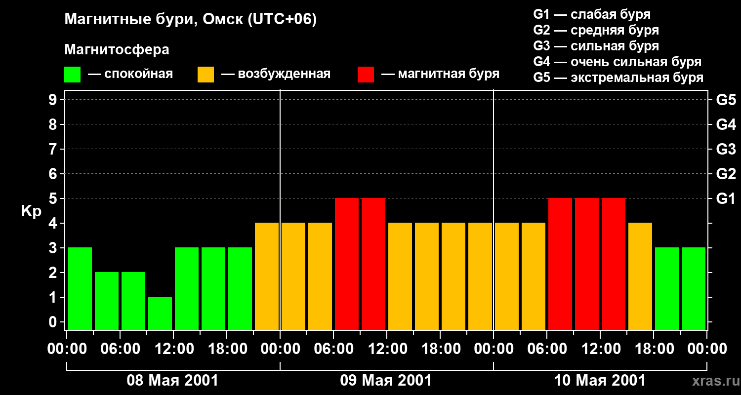 Изменения геомагнитного индекса Kp с 8 по 10 мая 2001 года для средних широт