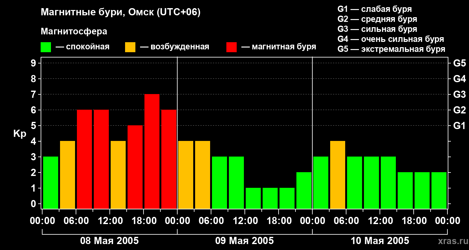 Изменения геомагнитного индекса Kp с 8 по 10 мая 2005 года для средних широт