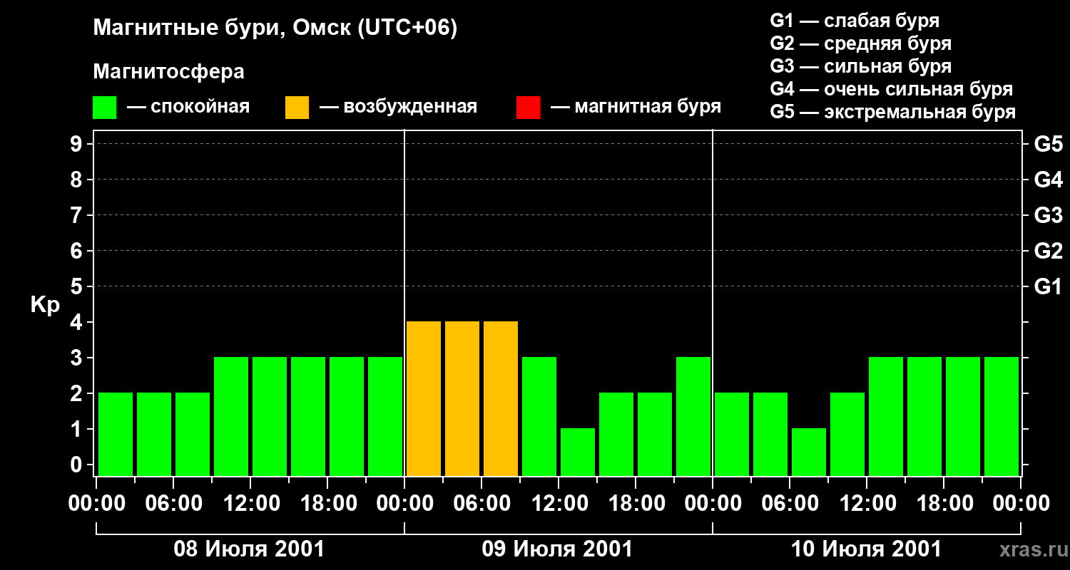 Изменения геомагнитного индекса Kp с 8 по 10 июля 2001 года для средних широт
