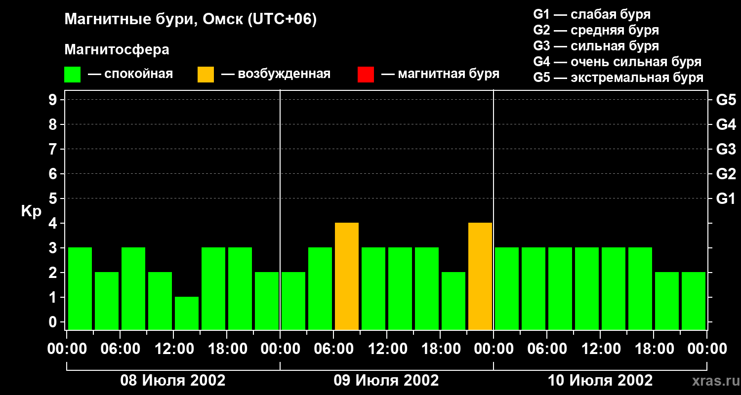 Изменения геомагнитного индекса Kp с 8 по 10 июля 2002 года для средних широт