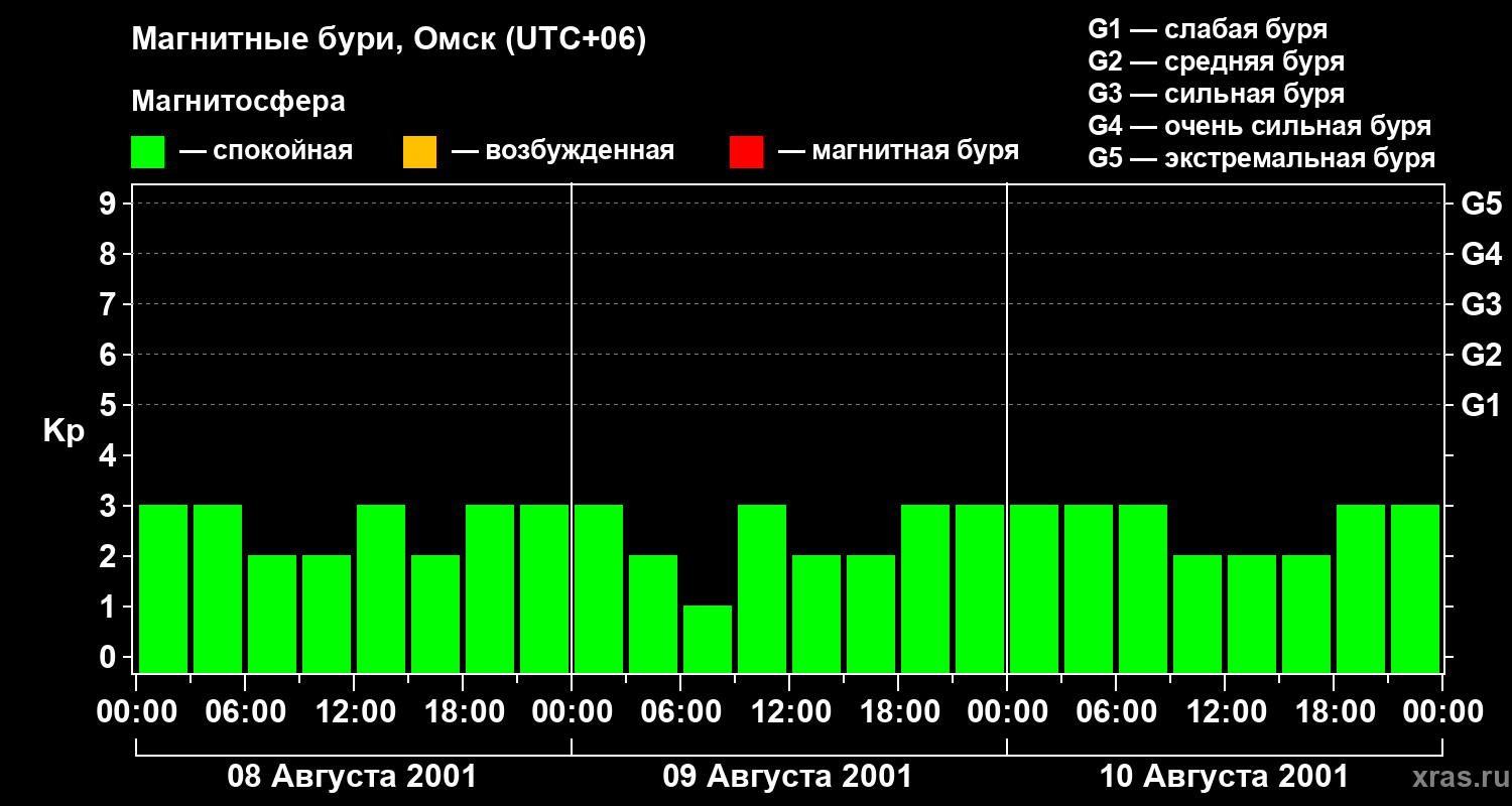 Изменения геомагнитного индекса Kp с 8 по 10 августа 2001 года для средних широт