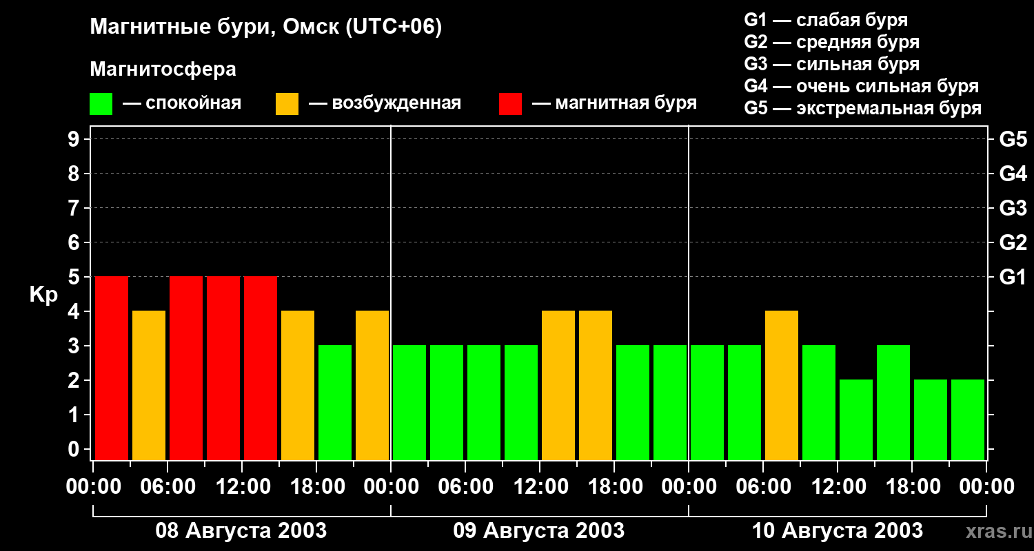 Изменения геомагнитного индекса Kp с 8 по 10 августа 2003 года для средних широт