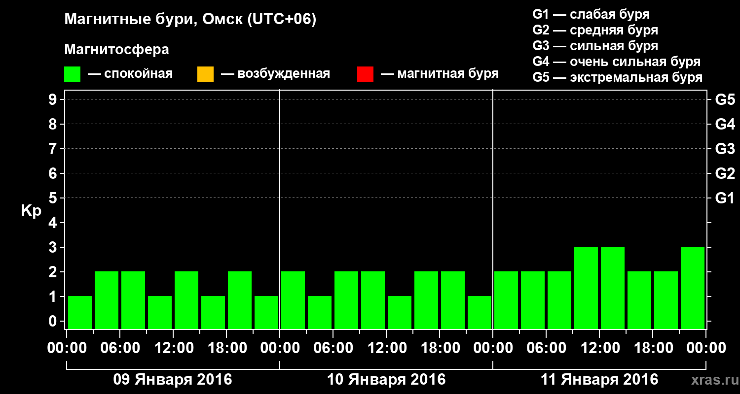 Изменения геомагнитного индекса Kp с 9 по 11 января 2016 года для средних широт
