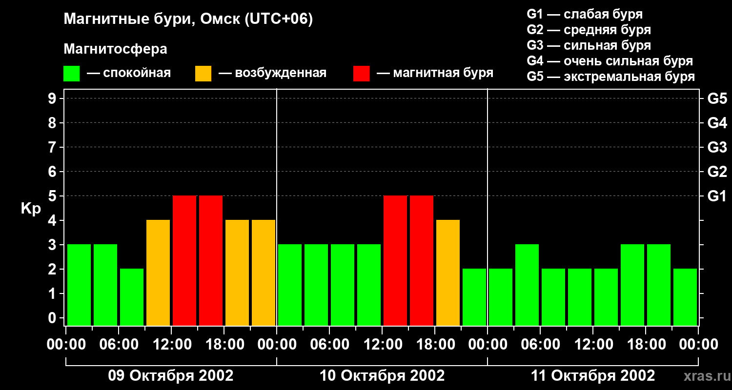 Изменения геомагнитного индекса Kp с 9 по 11 октября 2002 года для средних широт