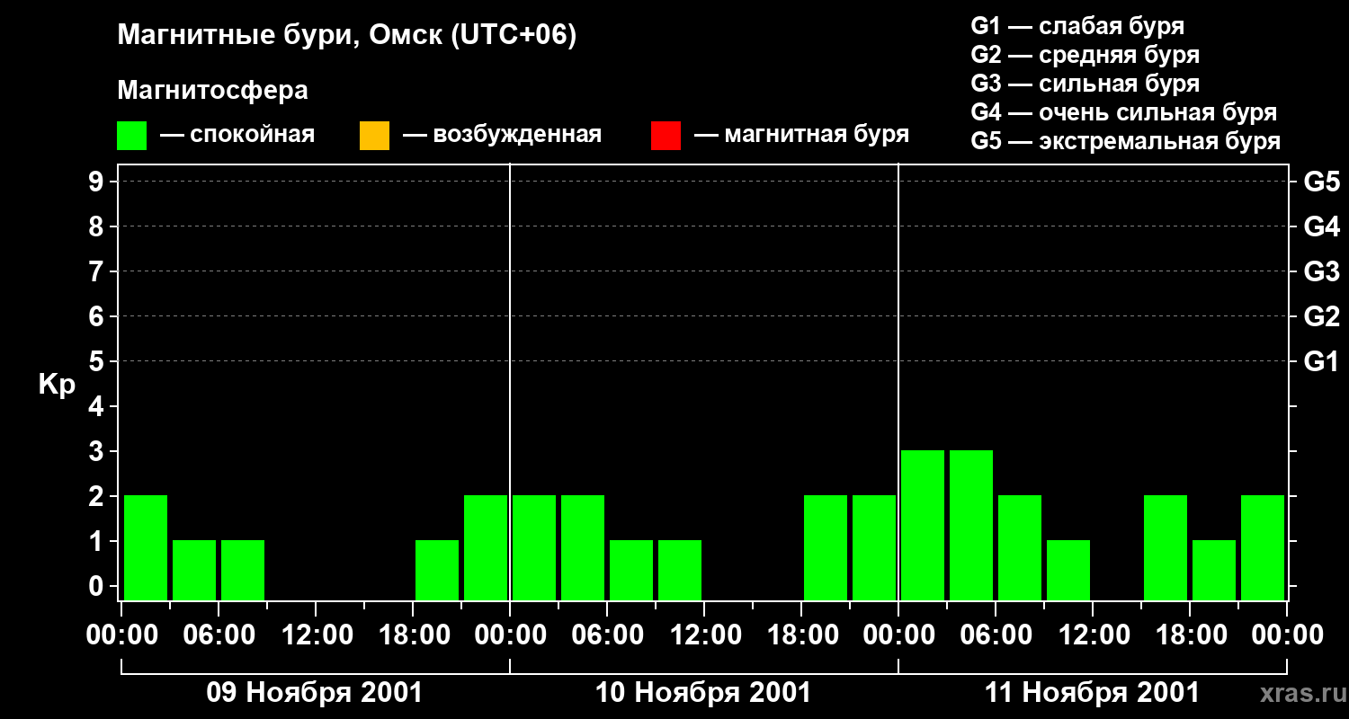 Изменения геомагнитного индекса Kp с 9 по 11 ноября 2001 года для средних широт