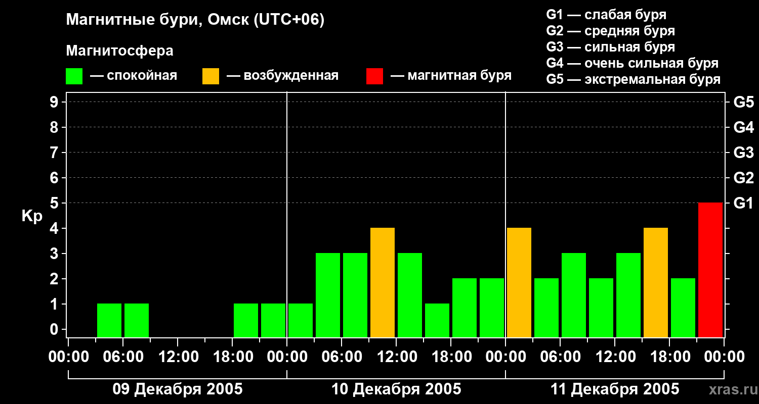 Изменения геомагнитного индекса Kp с 9 по 11 декабря 2005 года для средних широт