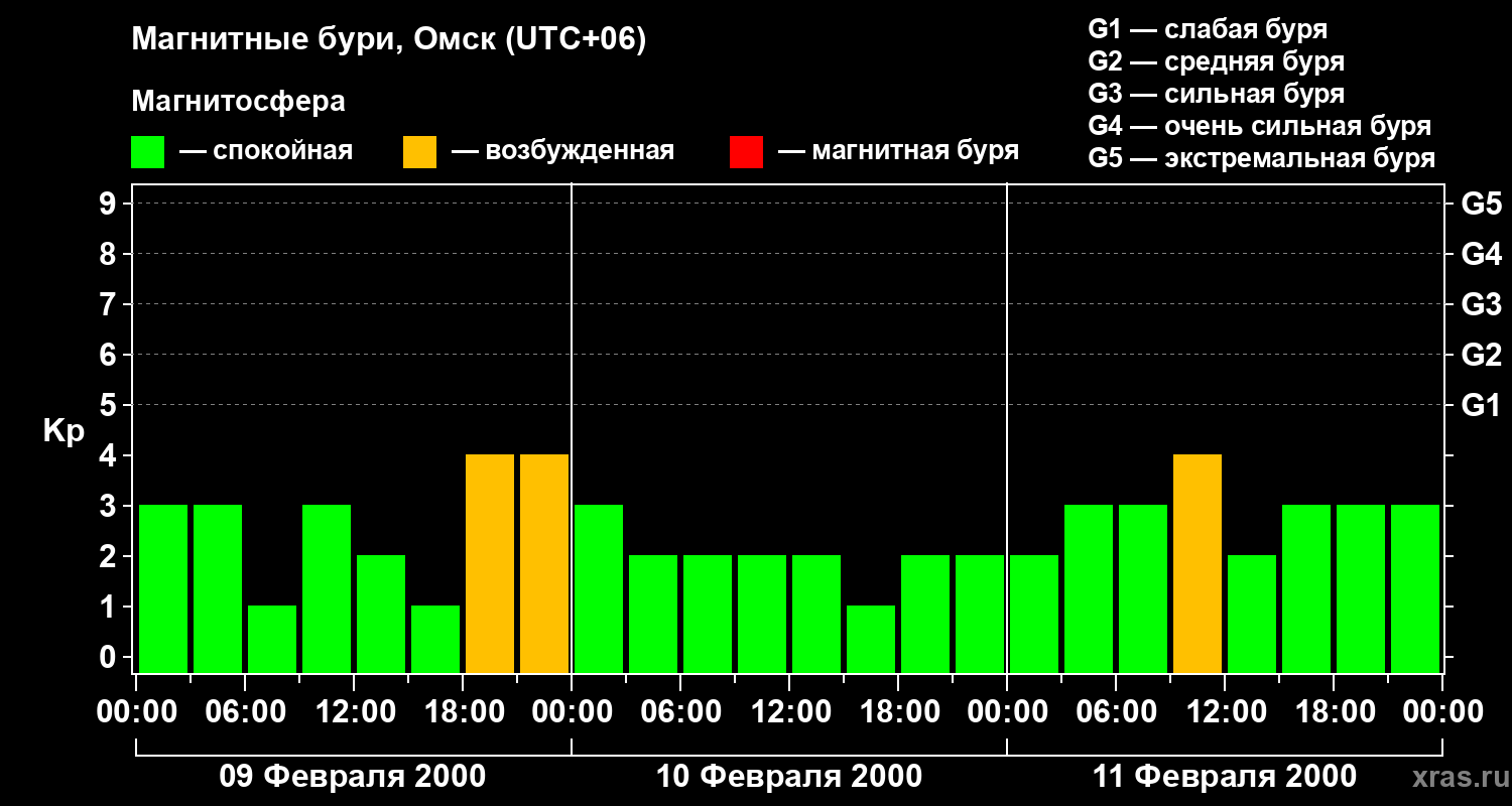 Изменения геомагнитного индекса Kp с 9 по 11 февраля 2000 года для средних широт