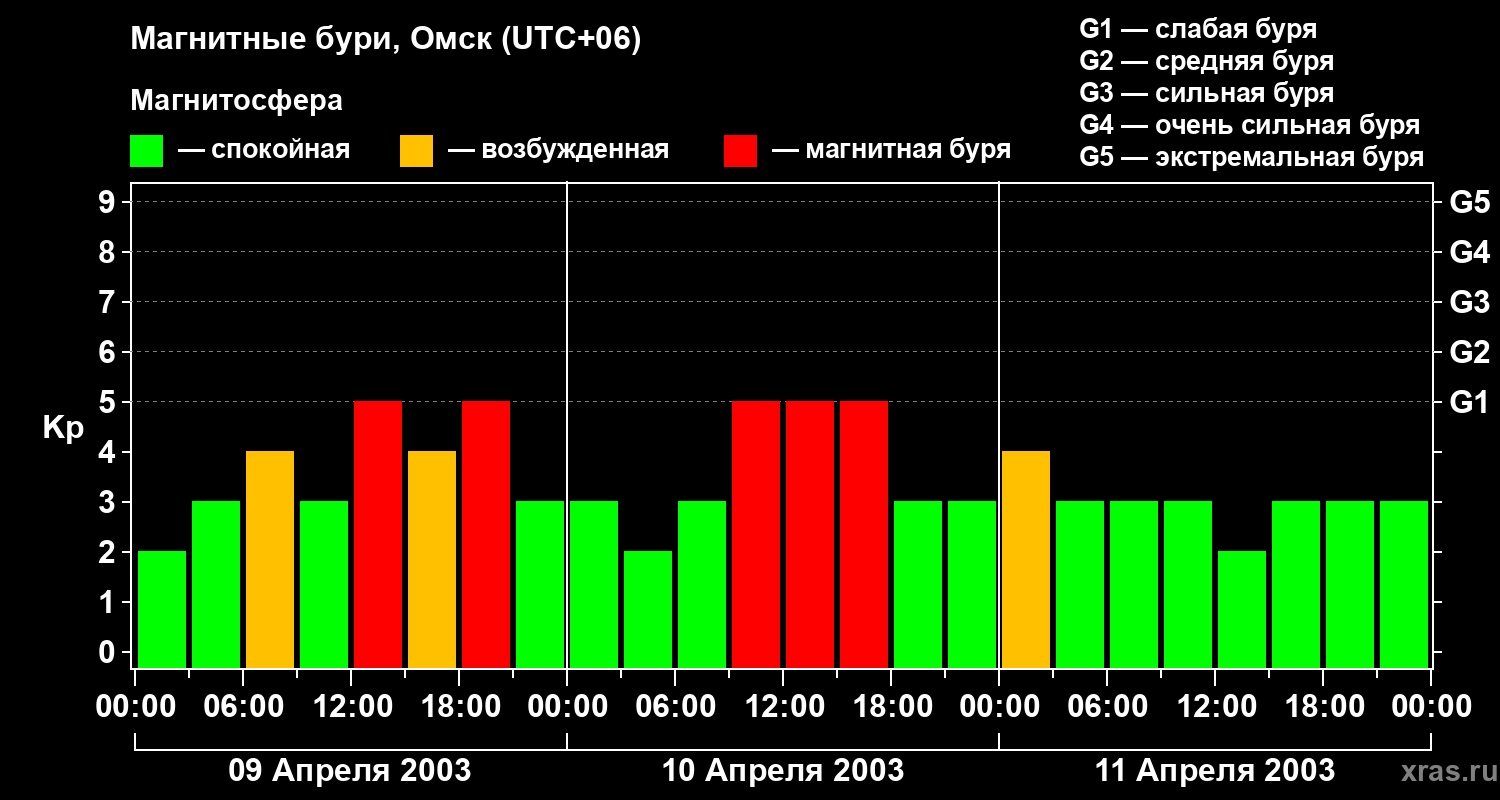 Изменения геомагнитного индекса Kp с 9 по 11 апреля 2003 года для средних широт